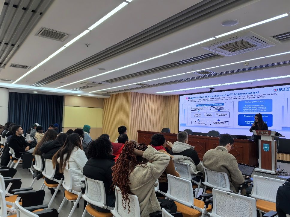Following the presentation, the floor was opened for a lively Q&A session. The international students, primarily enrolled in the School of Management’s MBA program, posed thoughtful questions regarding ZTTSC’s job requirements, career development paths, and company culture. Ms. Zhang provided detailed responses, elucidating the roles and responsibilities of positions such as After-Service Engineer (Foreign) and Overseas Sales Manager.